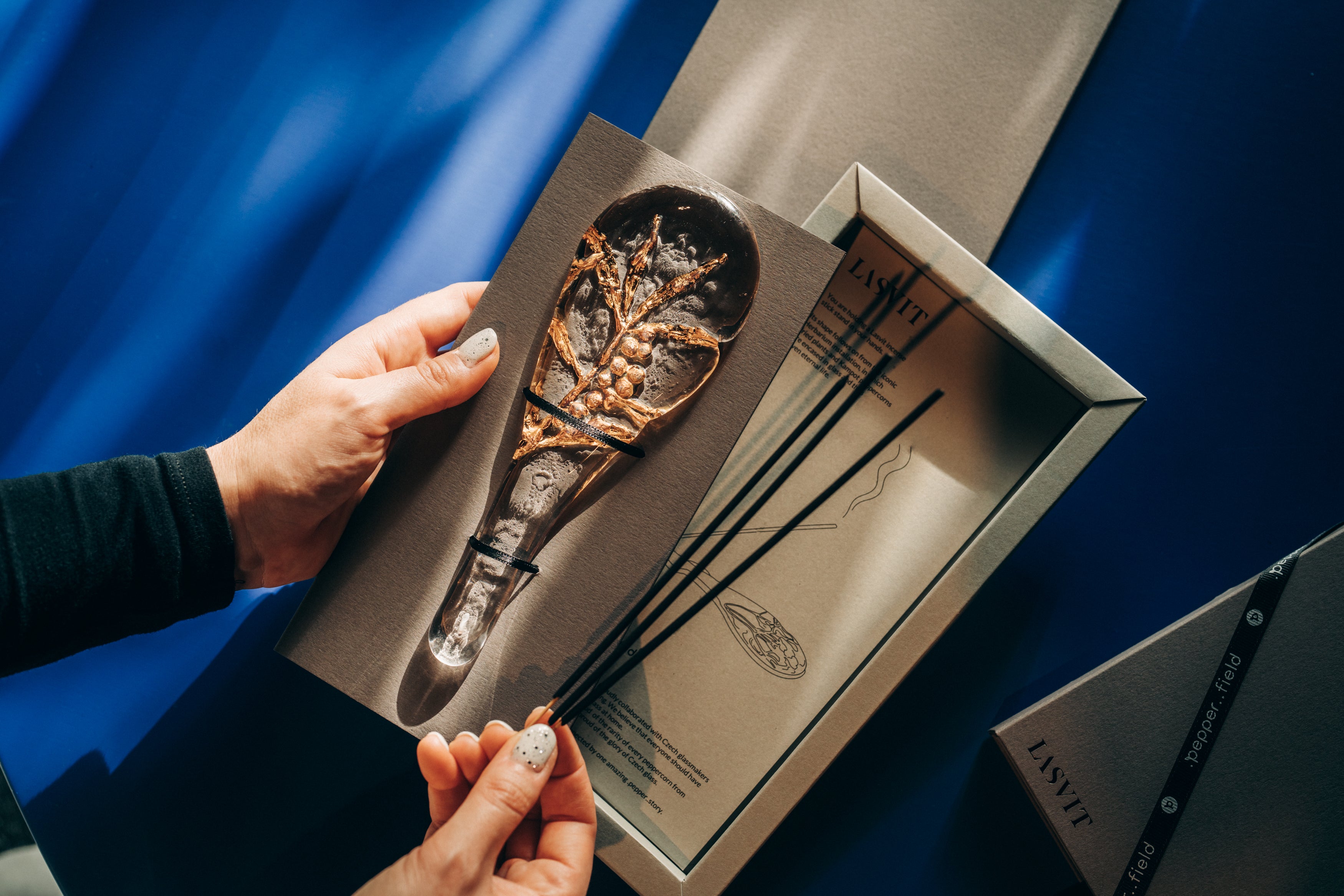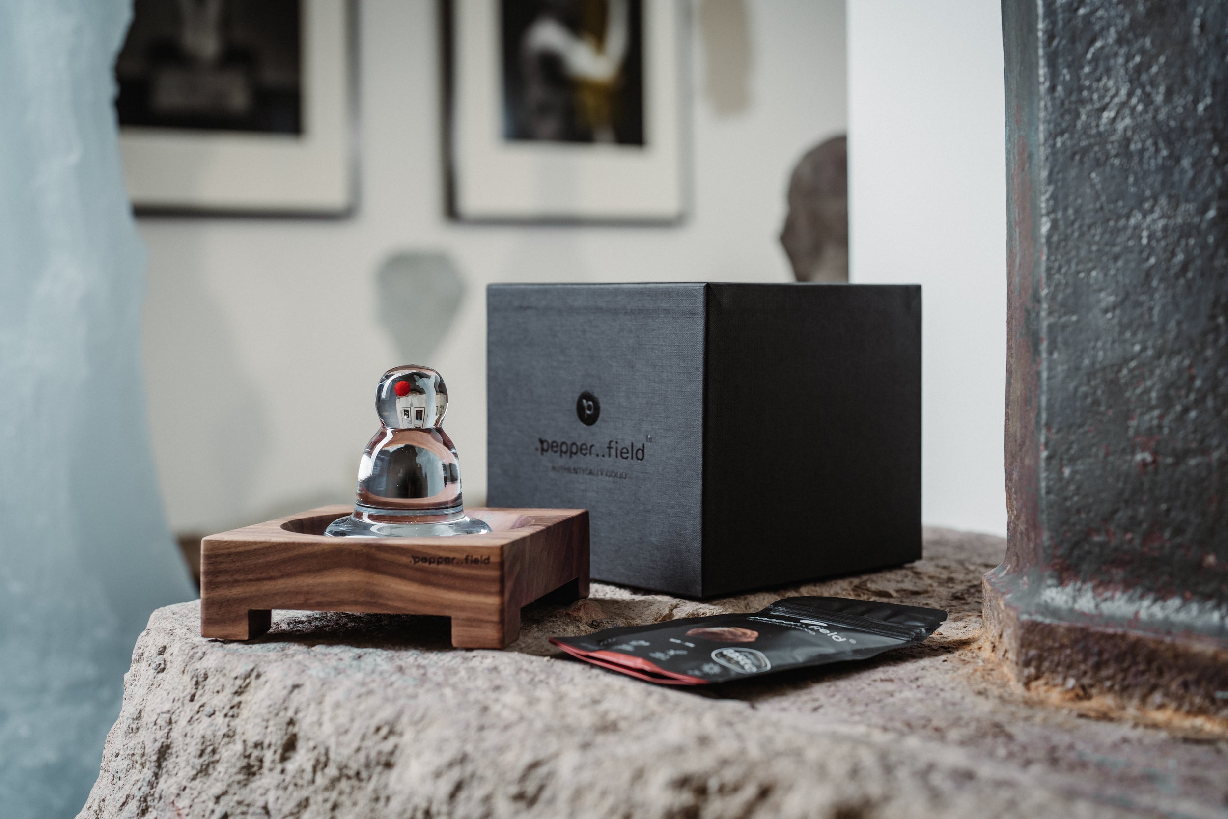 Křišťálový, ručně slévaný stojánek jsme v Lasvit sklárně společně vyrobili v nákladu 200 kusů. Každý ze stojánků je sklářský unikát v jiném tvaru a velikosti a obsahuje v sobě odlišné ornamenty tvořené vylévanými kuličkami černého Kampotského pepře a pepřových stonků. Výsledný otisk je vyzlacen pravým zlatem.