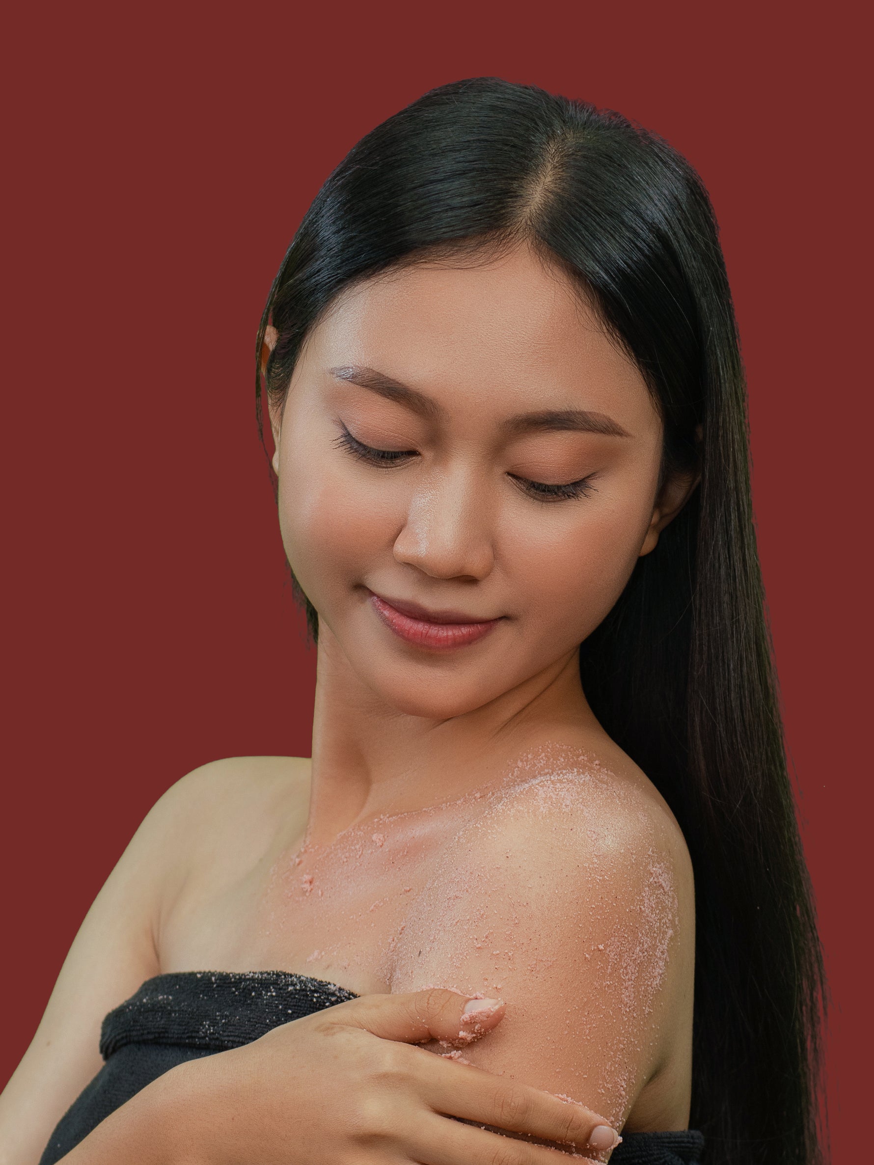 Kokosový olej: pro výživu, hydrataci a perfektní zvláčení pokožky. Přispívá ke zlepšení přirozené ochranné bariéry pokožky a k rychlému zklidnění suché a zcitlivělé pokožky. Rýžový olej: pro výživu, hydrataci a dokonalou jemnost pokožky. Mimořádně účinný anti-aging efekt. Rýžový a kávový prášek: pro velmi jemný peeling a dokonalé zjemnění pokožky těla. Jasmín: pro hydrataci a okouzlující vůni
