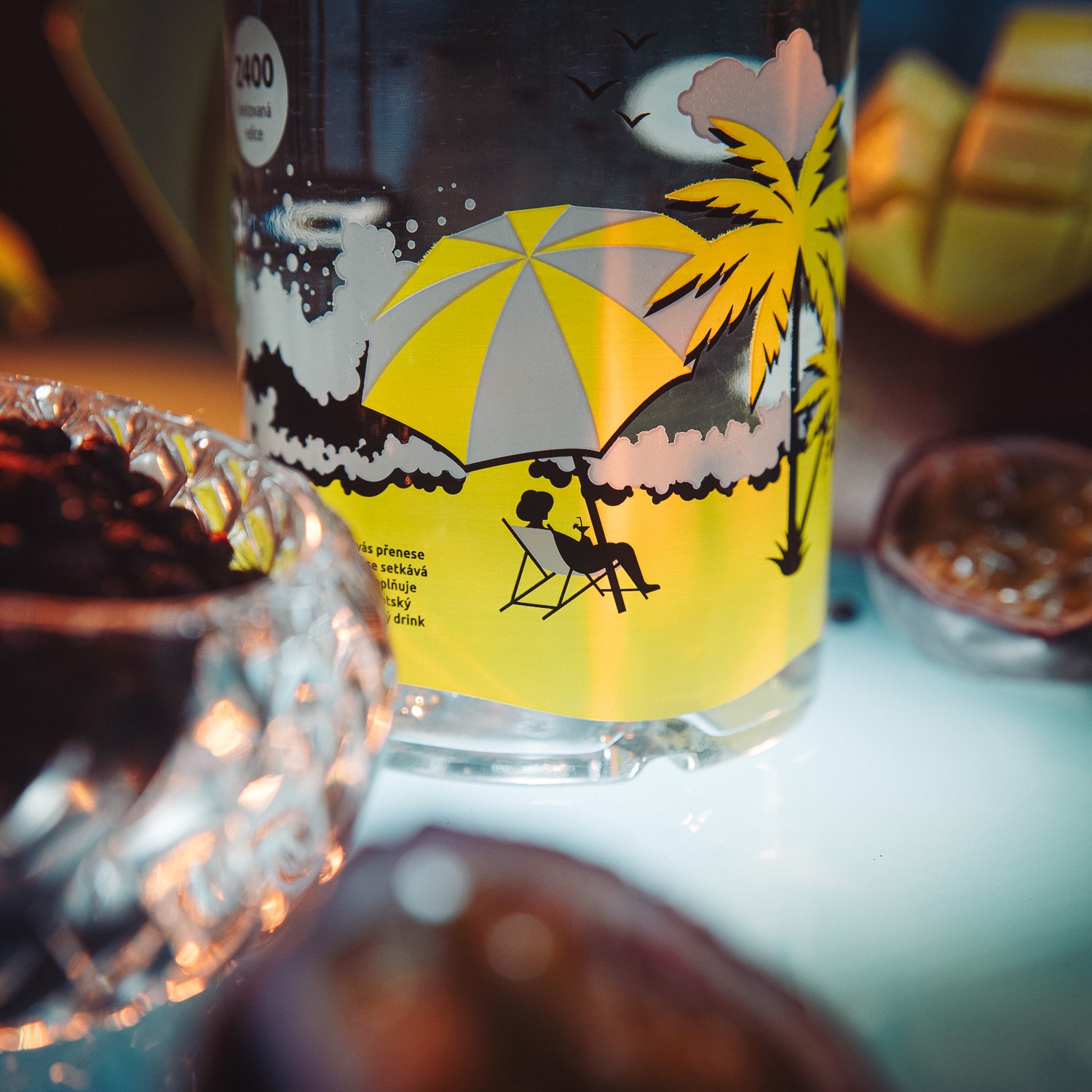 Designová lahev je poprvé potištěna tropickou pláží z naší autorské tvorby.